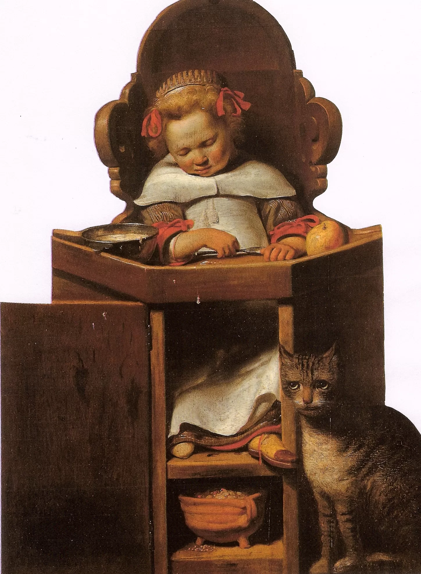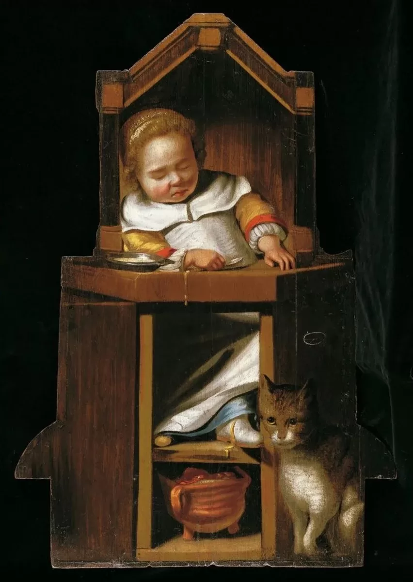 Cornelis Bisschop (Figura 3, abaixo) e Johannes Verspronck (Figura 4, abaixo) abordaram um motivo semelhante: uma criança – ou, no caso de Verspronck, uma menina – sentada em uma cadeirinha alta para comer, com uma fonte de aquecimento incorporada. Embora o torpor possa ser atribuído a uma refeição abundante, é tentador imaginar que o verdadeiro responsável pelo sono profundo tenha sido a exposição ao monóxido de carbono. Em ambos os casos, a expressão sonolenta e o rubor intenso do rosto reforçam essa hipótese.
