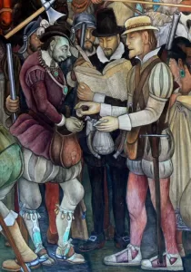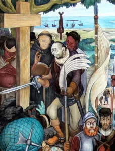 Em 1951, o muralista mexicano Diego Rivera criou o afresco intitulado “O Desembarque dos Espanhóis”, atualmente localizado no Palácio Nacional da Cidade do México (Figura 1). Esta obra constitui uma reinterpretação historiográfica do evento ocorrido em 22 de abril de 1519, Quinta-feira Santa, data que marca o início da conquista. Contudo, a representação não é neutra; ela é imbuída da forte intenção política do artista e do espírito indigenista de meados do século XX. Rivera se afasta deliberadamente da iconografia clássica que glorifica o conquistador, optando, em vez disso, por uma desconstrução visual do mito heroico.
