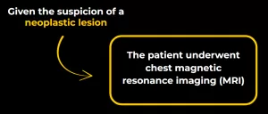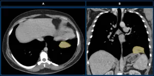 Axial (A) and coronal (B) CT scans (mediastinal window) demonstrate a solid, well-defined, homogeneous lesion with soft-tissue density (yellow dotted line) located at the base of the left hemithorax.