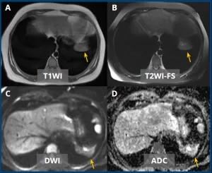 Axial MRI images in T1-weighted (A), T2-weighted with fat suppression (B), DWI (C), and ADC (D) sequences demonstrate a lesion with elongated/discoid morphology, centered at the base of the left hemithorax (yellow arrows), demonstrating isointense signal on T1, mildly hypointense signal on T2, and no diffusion restriction.