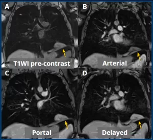 Pre-contrast (A) and post-contrast T1-weighted sequences in the arterial (B), portal venous (C), and delayed (D) phases, all with fat suppression, demonstrate slow and progressive enhancement after contrast administration (yellow arrows).