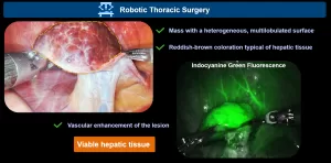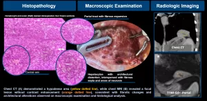 Postoperative chest MRI Postoperative axial T1-weighted MRI (A) demonstrating successful resection of the ectopic hepatic lesion previously located at the base of the left hemithorax.The patient experienced complete resolution of symptoms and no further complaints following surgical resection and definitive diagnosisDespite its benign nature, the diagnosis was clinically significant: histopathology revealed that the ectopic liver tissue was already cirrhotic, representing a potential precursor to hepatocellular carcinoma (HCC) if left undetected.