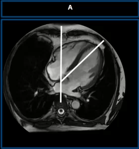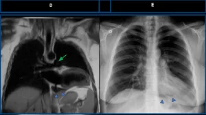 Axial chest MRI of a healthy control (A) demonstrates normal cardiac rotation. A vertical reference line is drawn along the spine. The cardiac axis forms an angle of less than 60° indicating normal positioning.Axial T1-weighted MRI (B) shows excessive clockwise rotation of the heart, with a cardiac axis angle greater than 60°, a characteristic finding of left pericardial agenesis. Axial T2-weighted MRI (C) confirms the abnormal cardiac orientation, supporting the diagnosis.Coronal T2-weighted MRI (D) demonstrates interposition of lung tissue in the aortopulmonary window (green arrow), as well as lung interposed between the diaphragm and the cardiac base (blue arrowheads). Frontal chest radiograph (E) also shows lung interposition between the diaphragm and the inferior cardiac border (blue arrowheads), consistent with left pericardial agenesis.