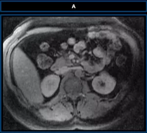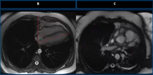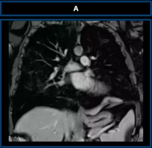 Coronal T1-weighted post-contrast MRI (A) shows a well-defined mass at the base of the left hemithorax with imaging features identical to native liver, including signal intensity and enhancement pattern — supporting the diagnosis of hepatic heterotopia.