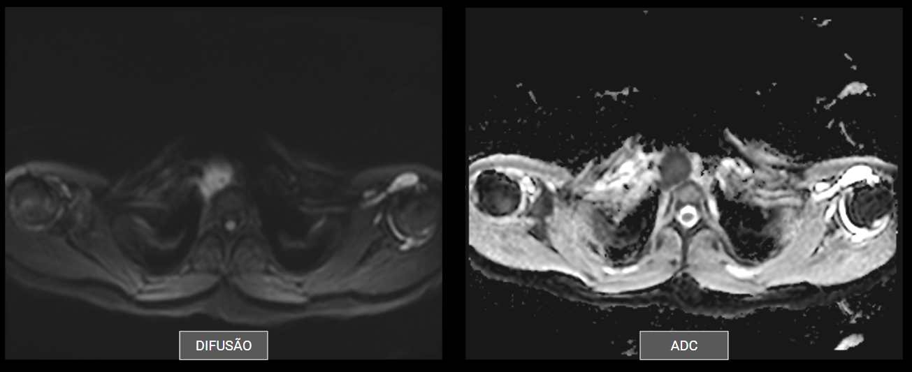 • Realizou TC de ombro direito devido a dor, principalmente à noite, e discreto edema. No mesmo dia, realizou TC de tórax para melhor avaliação do achado do exame anterior.