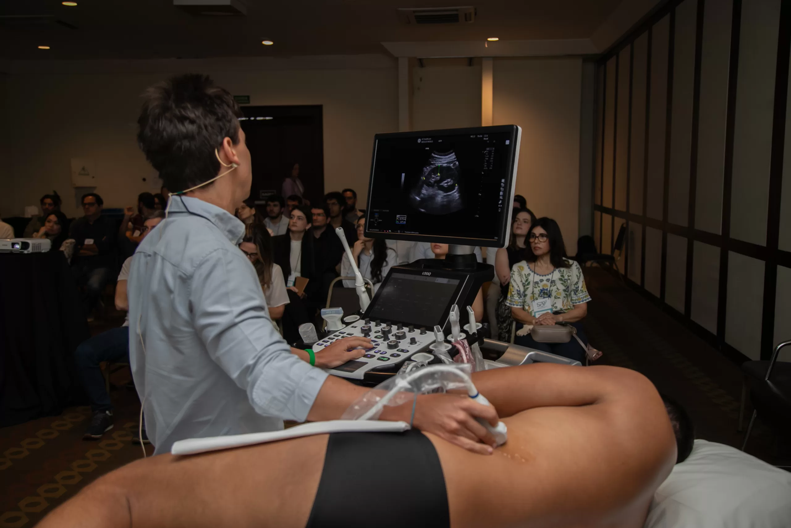 Paralelamente, na Sala Prímula, ocorreram as Práticas de Ultrassom, moderadas pelos Drs. Mauro José Brandão da Costa, Henrique Simão Trad e Paulo Moraes Agnollitto. As aulas foram conduzidas pelos Drs. Mario Junqueira Andrade D’Avila, Luiz Mario Pereira Lopes Labadessa, Eduardo Carnier Dornelas e pela Dra. Rosa Maria Silveira Sigrist, com demonstrações práticas sobre Doppler e Ultrassom Dermatológico, incluindo exames vasculares, mapeamento facial e anatomia aplicada.