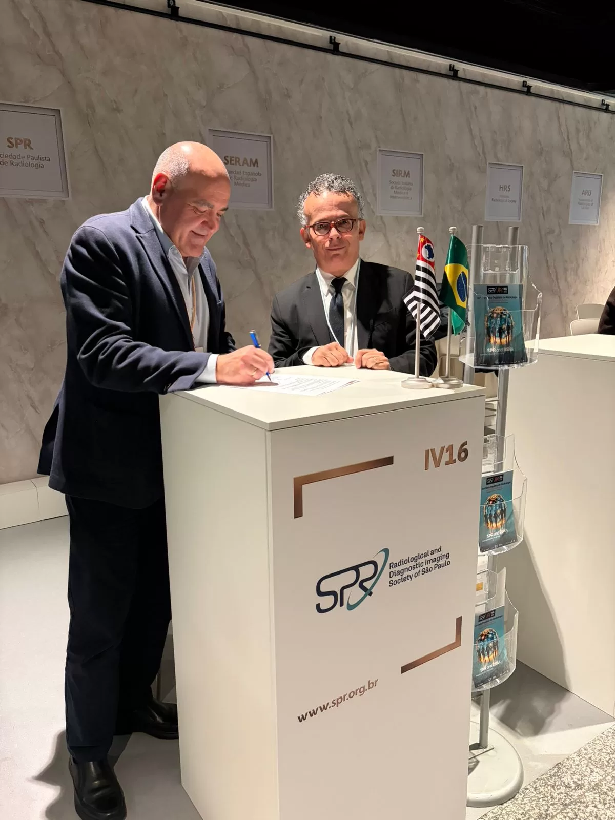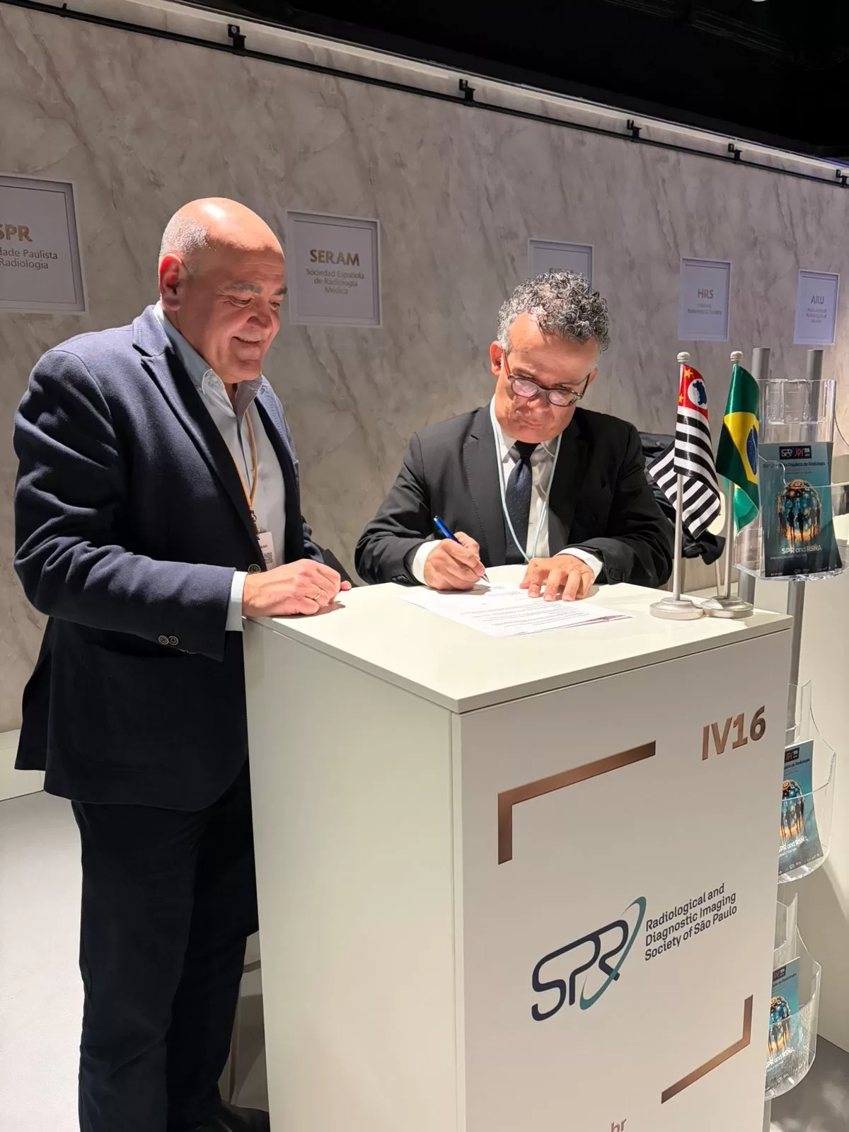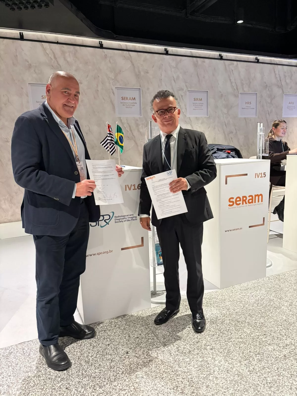 Outro momento importante da agenda institucional foi a reunião com a Sociedade Espanhola de Radiologia Médica (SERAM). Durante o encontro, os presidentes Dr. Douglas Racy e Dr. José Carmelo Albillos Merino renovaram o memorando de cooperação entre as duas entidades. O acordo garante a continuidade do intercâmbio de professores, participação em atividades científicas e compartilhamento de conteúdo educacional, fortalecendo a colaboração entre radiologistas brasileiros e espanhóis.