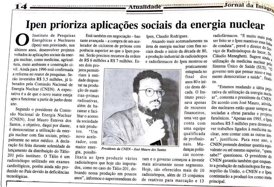 Estavam então previstos investimentos para reformas no reator de pesquisas e para a aquisição de um acelerador de partículas (Cíclotron), equipamento que permitiria ao Ipen ampliar e nacionalizar a produção de radioisótopos. A matéria destacava, ainda, o papel da Comissão Nacional de Energia Nuclear (CNEN) na tentativa de democratizar o uso da energia nuclear com fins sociais, especialmente por meio do Sistema Único de Saúde (SUS).