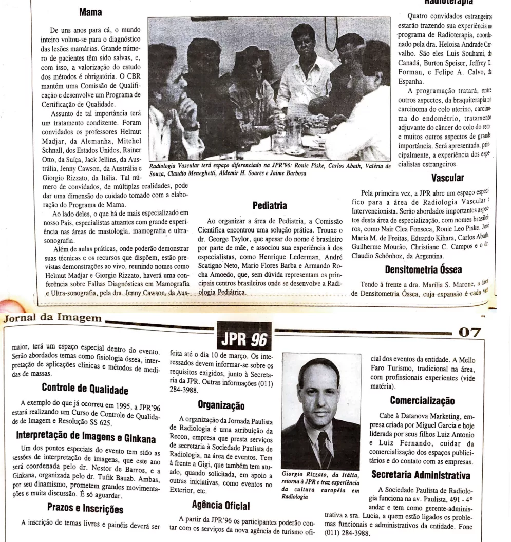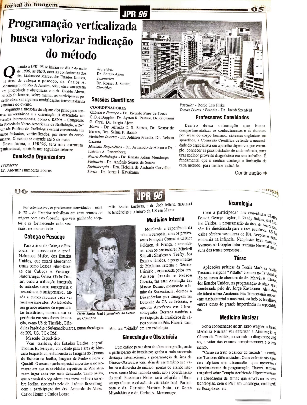 A edição de 1996 do Jornal da Imagem destacou a proposta da Jornada Paulista de Radiologia (JPR 96) de adotar uma programação verticalizada, organizada por sistemas e especialidades, com o objetivo de valorizar a correta indicação dos métodos de diagnóstico por imagem. Inspirado em modelos adotados por grandes centros universitários e alinhado às diretrizes internacionais, o evento buscava aprofundar o conhecimento técnico dos participantes, promovendo uma compreensão mais precisa das aplicações e limitações de cada método.